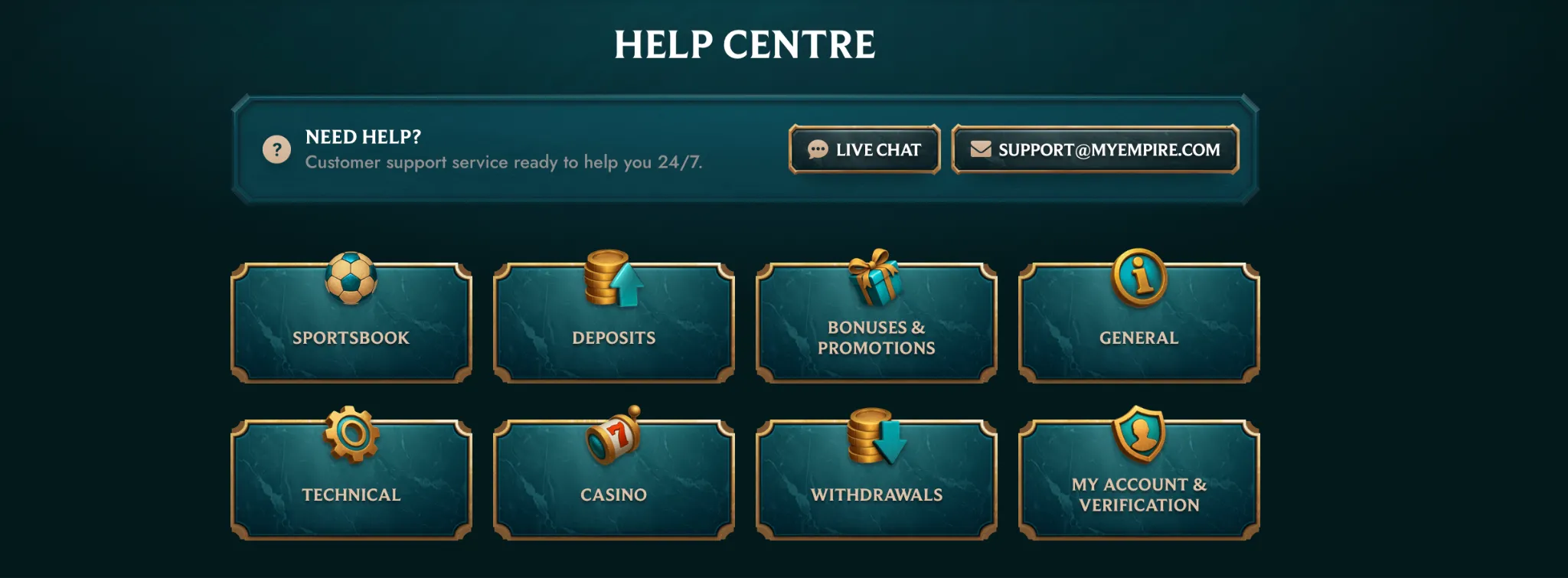 No matter if you struggle to apply the MyEmpire promo code for the desired bonus or face other challenges, a helpful customer support team is always there for you. The MyEmpire casino real money experience is always safe and guided. Use live chat or other options to stay in touch with the support representatives. Play big to join the VIP program and get a personal manager, along with a plethora of other perks.